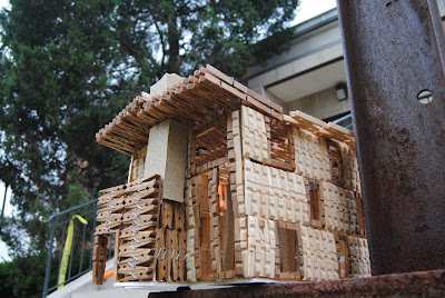 I chose clothespins. They were easy to manipulate by taking them apart and cutting them down. To show different woods and textures, I stained some clothespins and used sand paper to show the texture of the chimney. In addition to contracting the piece, I had to photograph the piece in three different environments.